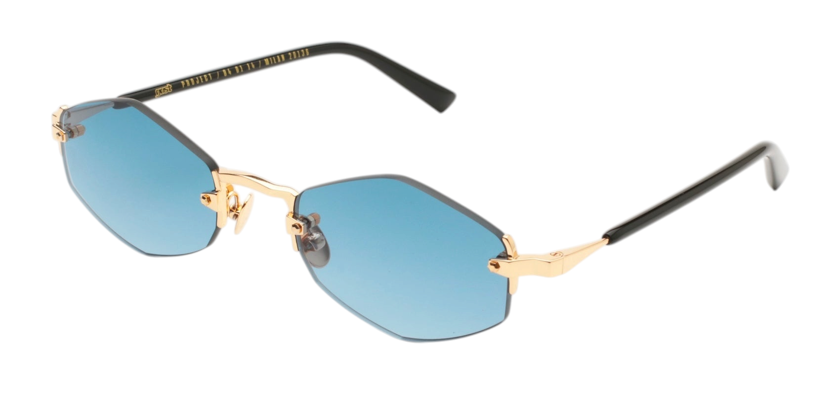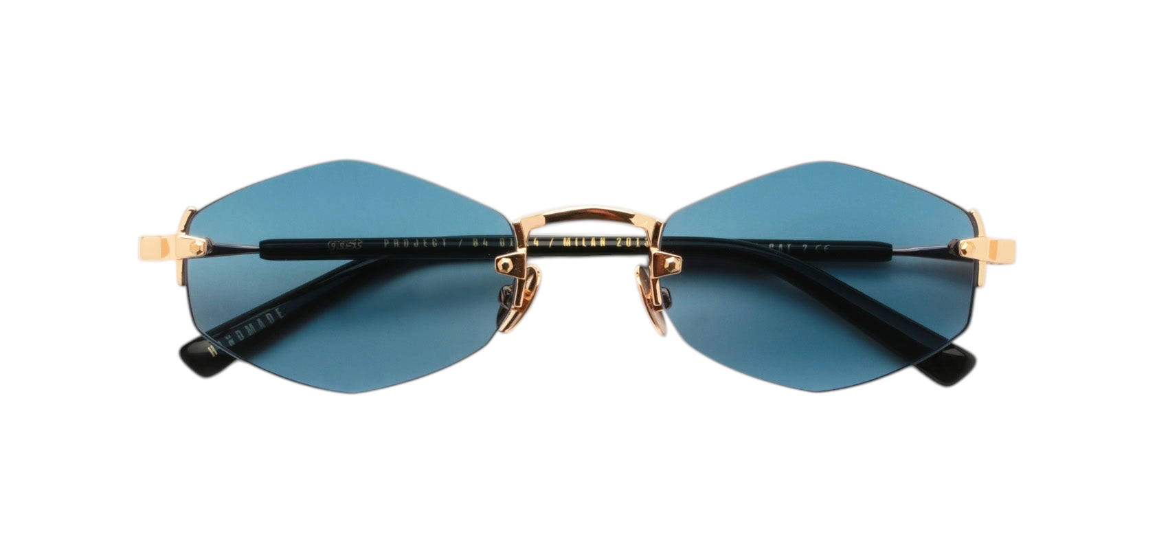 Безоправные солнцезащитные очки GAST Lunar формы «ромб» с линзами синего цвета с градиентом, дужки выполнены из нержавеющей стали золотистого оттенка со вставками из черного ацетата.