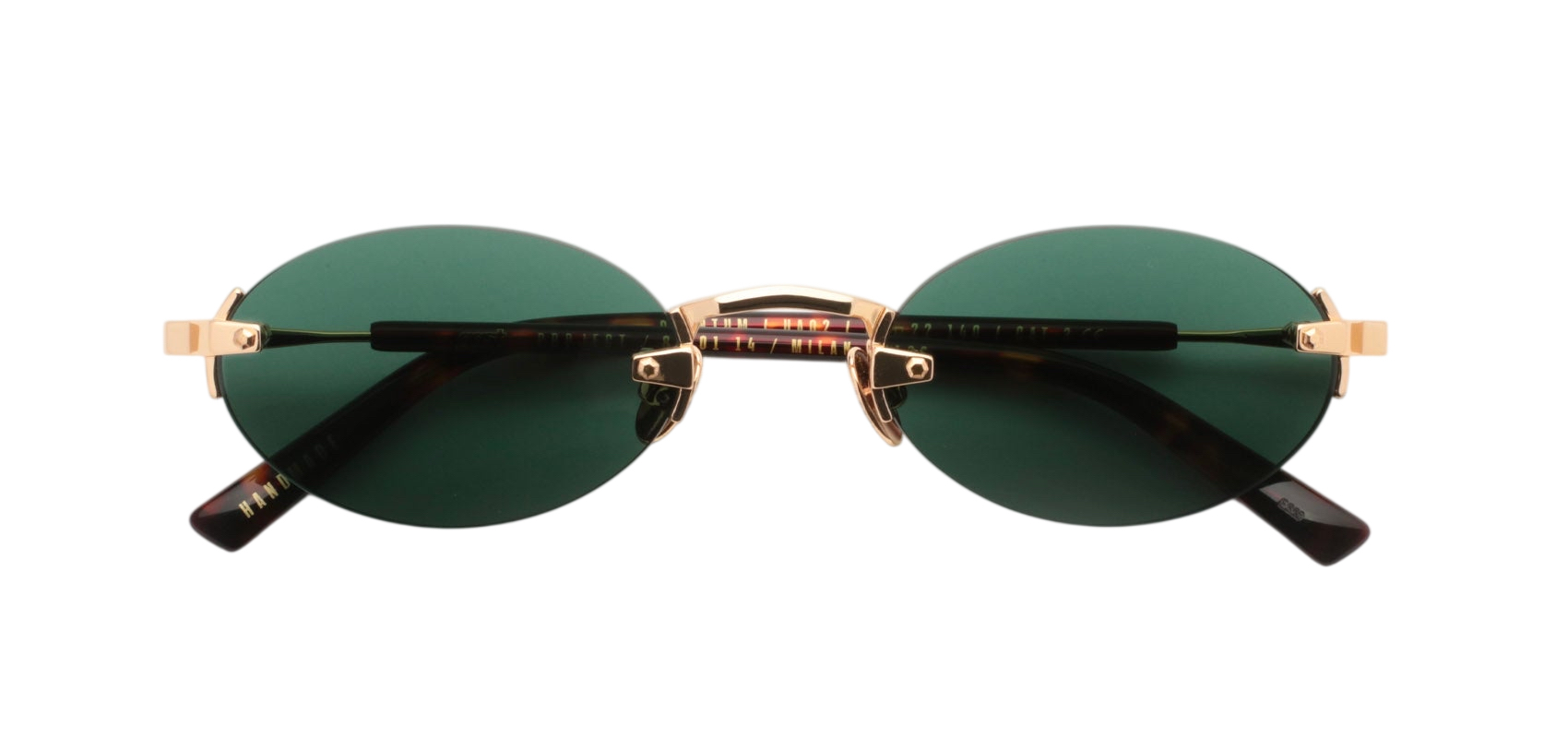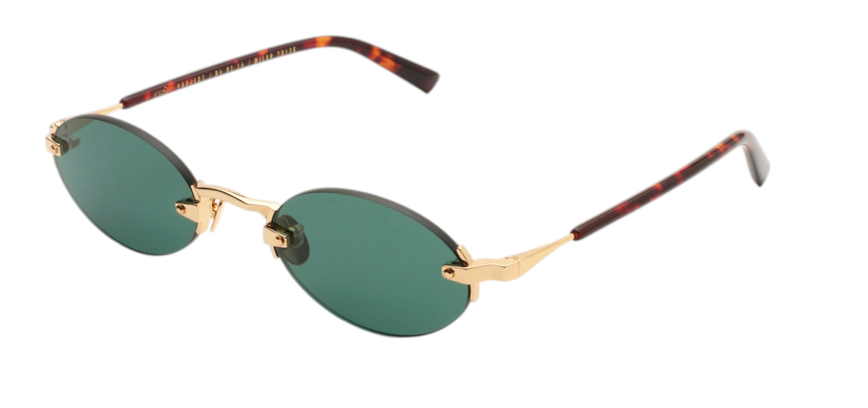 Безоправные солнцезащитные очки GAST Quantum овальной формы с линзами темно-зеленого цвета, дужки выполнены из нержавеющей стали золотистого оттенка со вставками из ацетата с черепаховым узором.