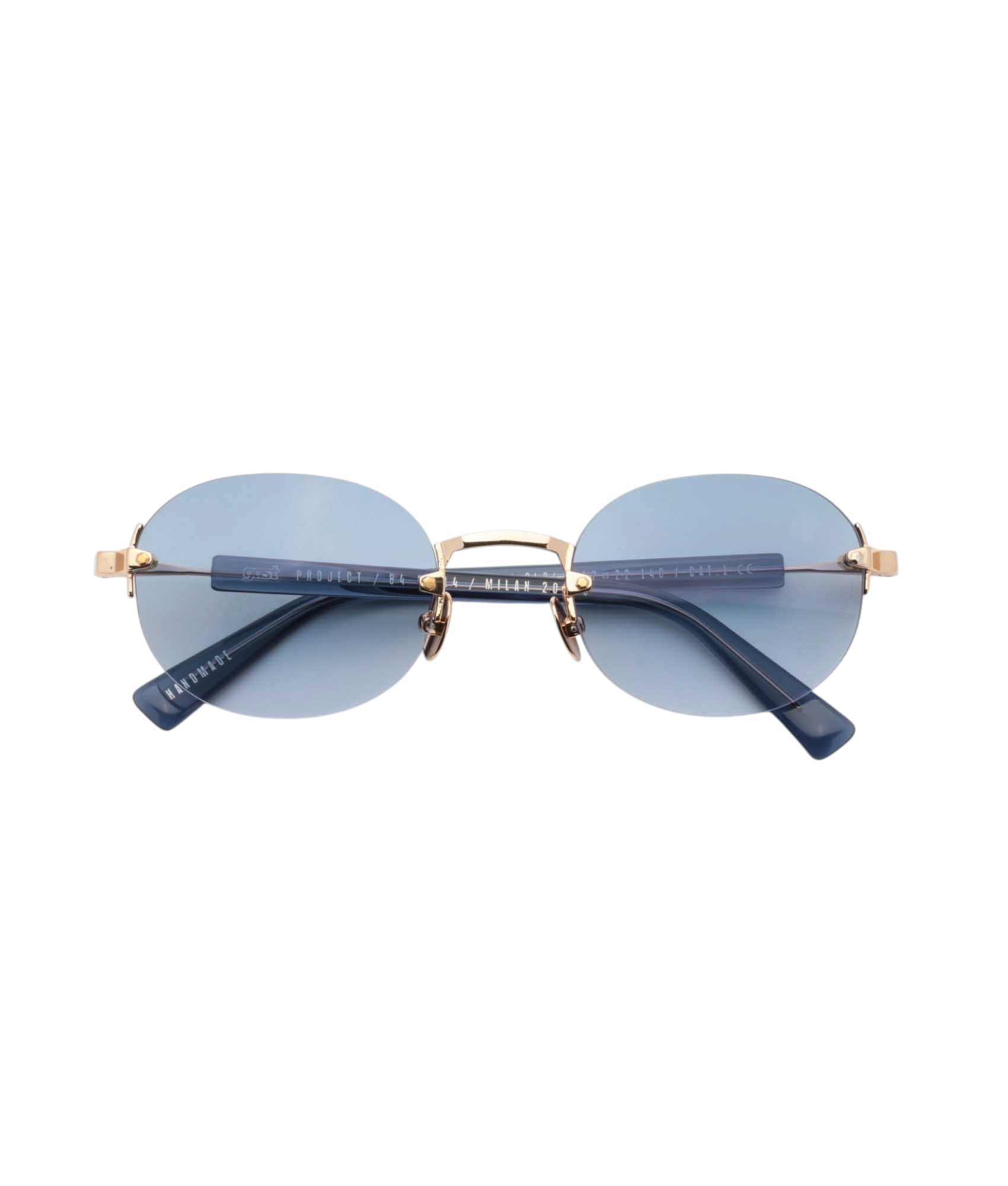 Безоправные солнцезащитные очки GAST Olli овальной формы с линзами синего цвета с градиентом, дужки выполнены из нержавеющей стали золотистого оттенка со вставками из синего ацетата.