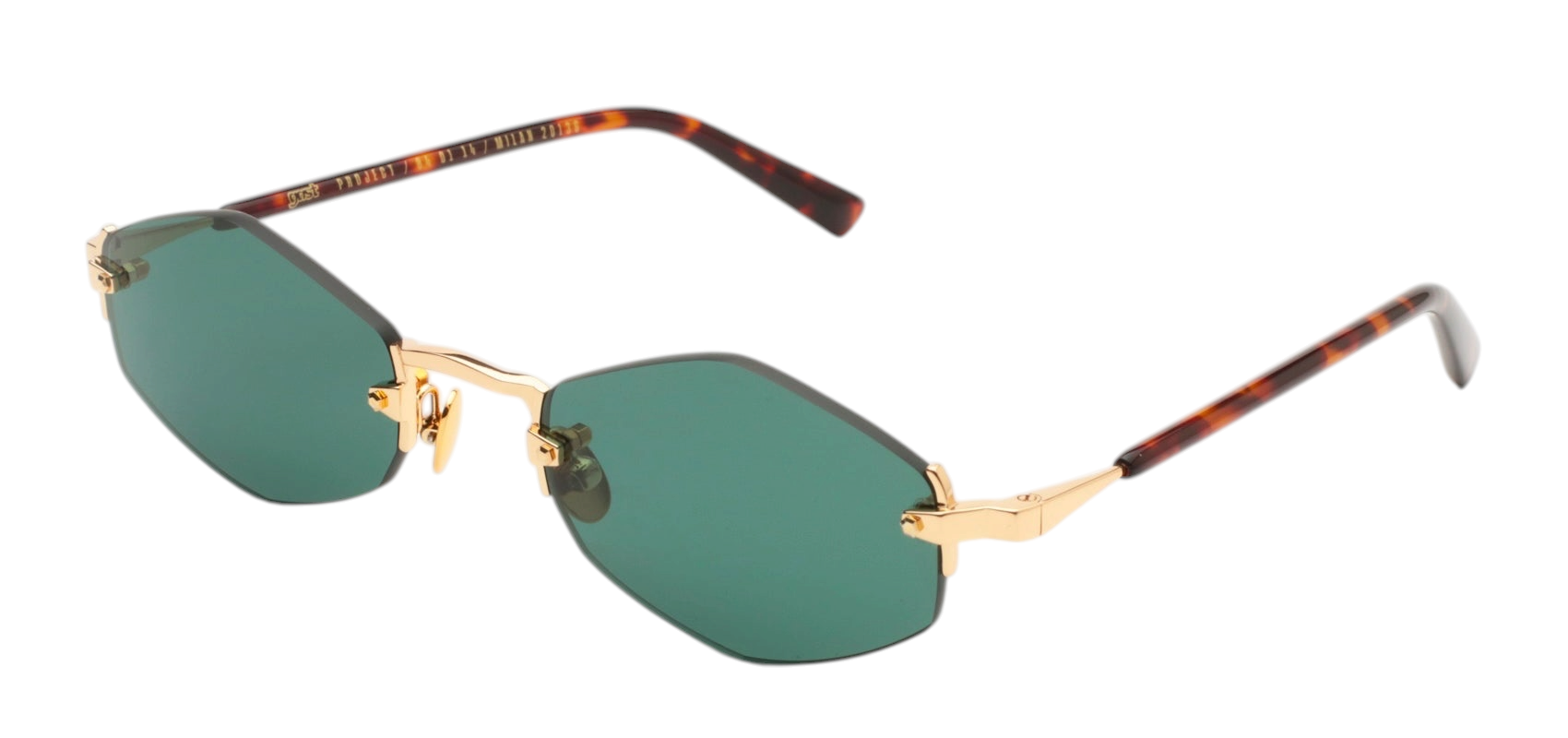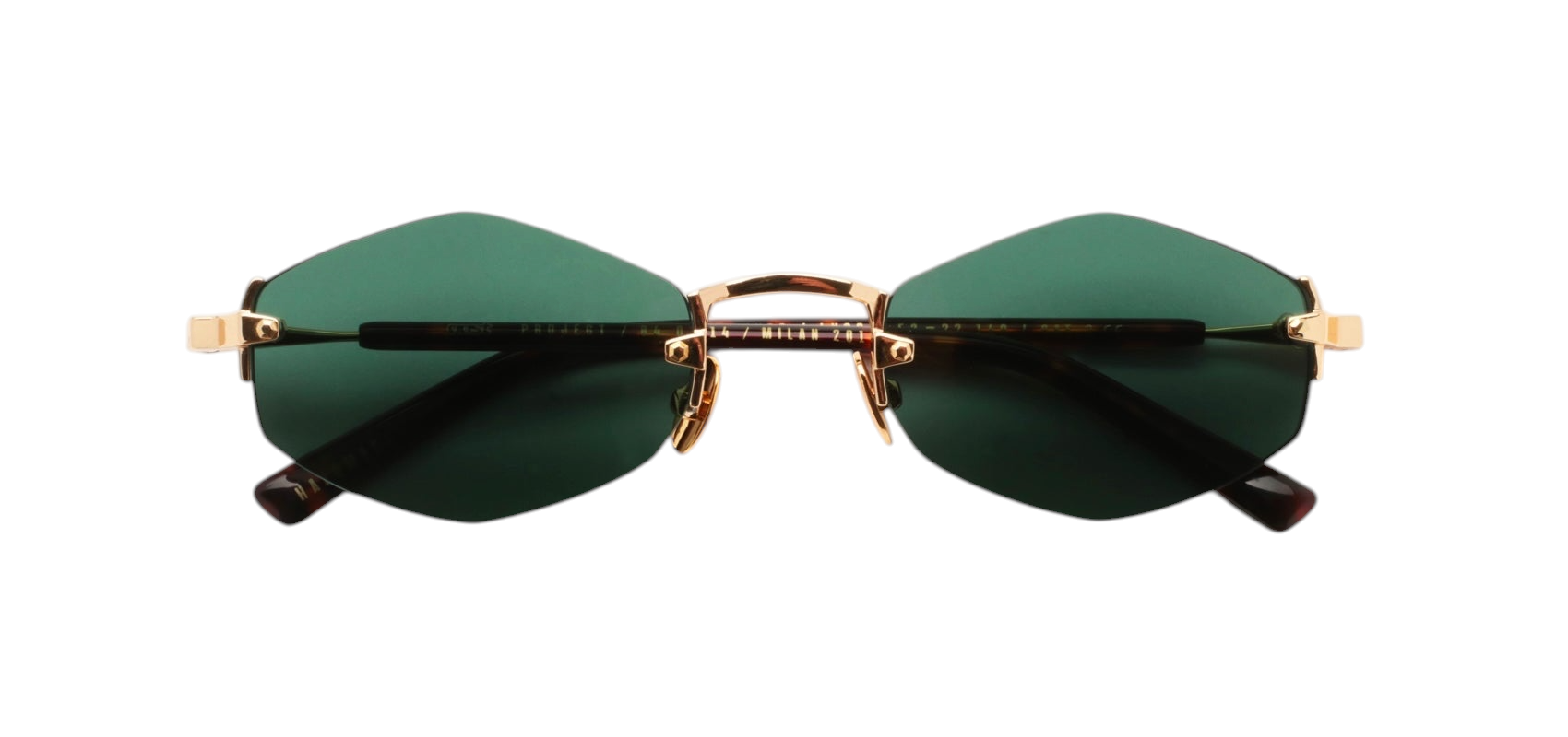 Безоправные солнцезащитные очки GAST Lunar формы «ромб» с линзами темно-зеленого цвета, дужки выполнены из нержавеющей стали золотистого оттенка со вставками из ацетата с черепаховым узором.