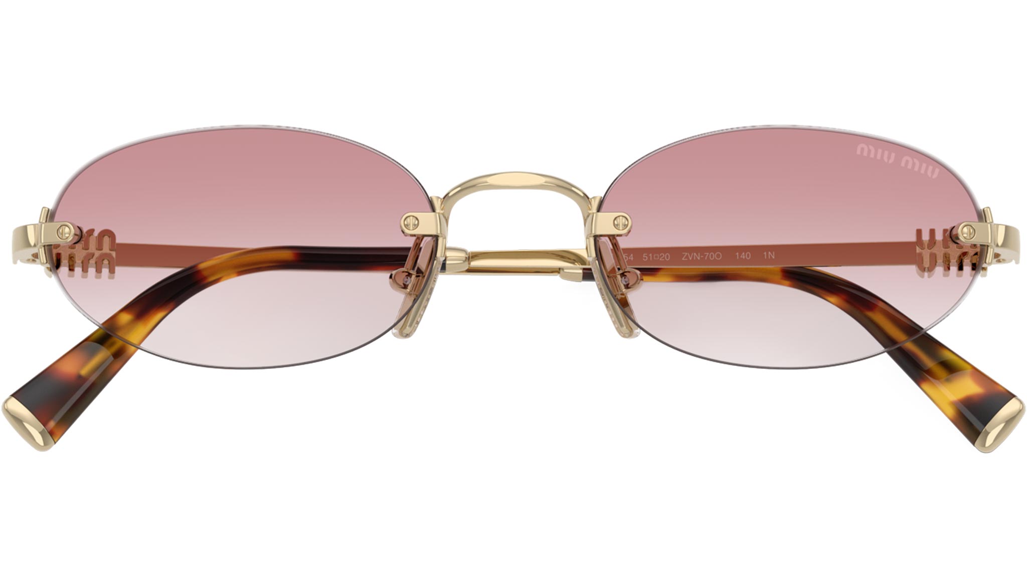 Один из хитов среди новинок Miu Miu – миниатюрные безободковые очки A54S овальной формы, которые сделают любой, даже самый простой образ более актуальным и стильным. Солнцезащитные очки с розовыми градиентными линзами в оправе из золотистого металла.