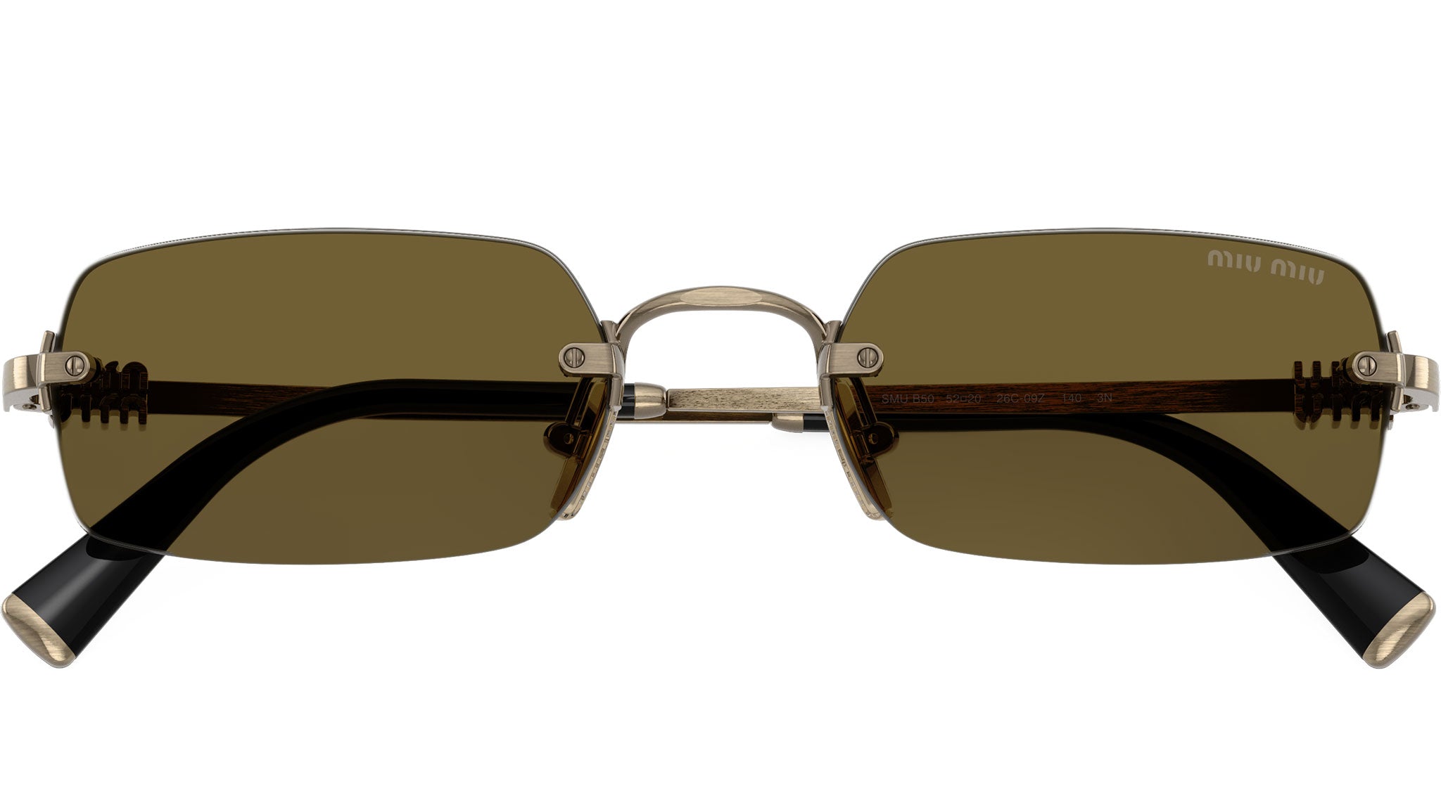 Новая прямоугольная форма безободковой модели Miu Miu с линзами темно-коричневого цвета и с бронзовыми дужками, украшенными фирменным логотипом бренда. Легкие, комфортные, с расслабленным стилем – их хочется носить каждый день и можно сочетать со всем: от голубых джинсов до легких платьев.