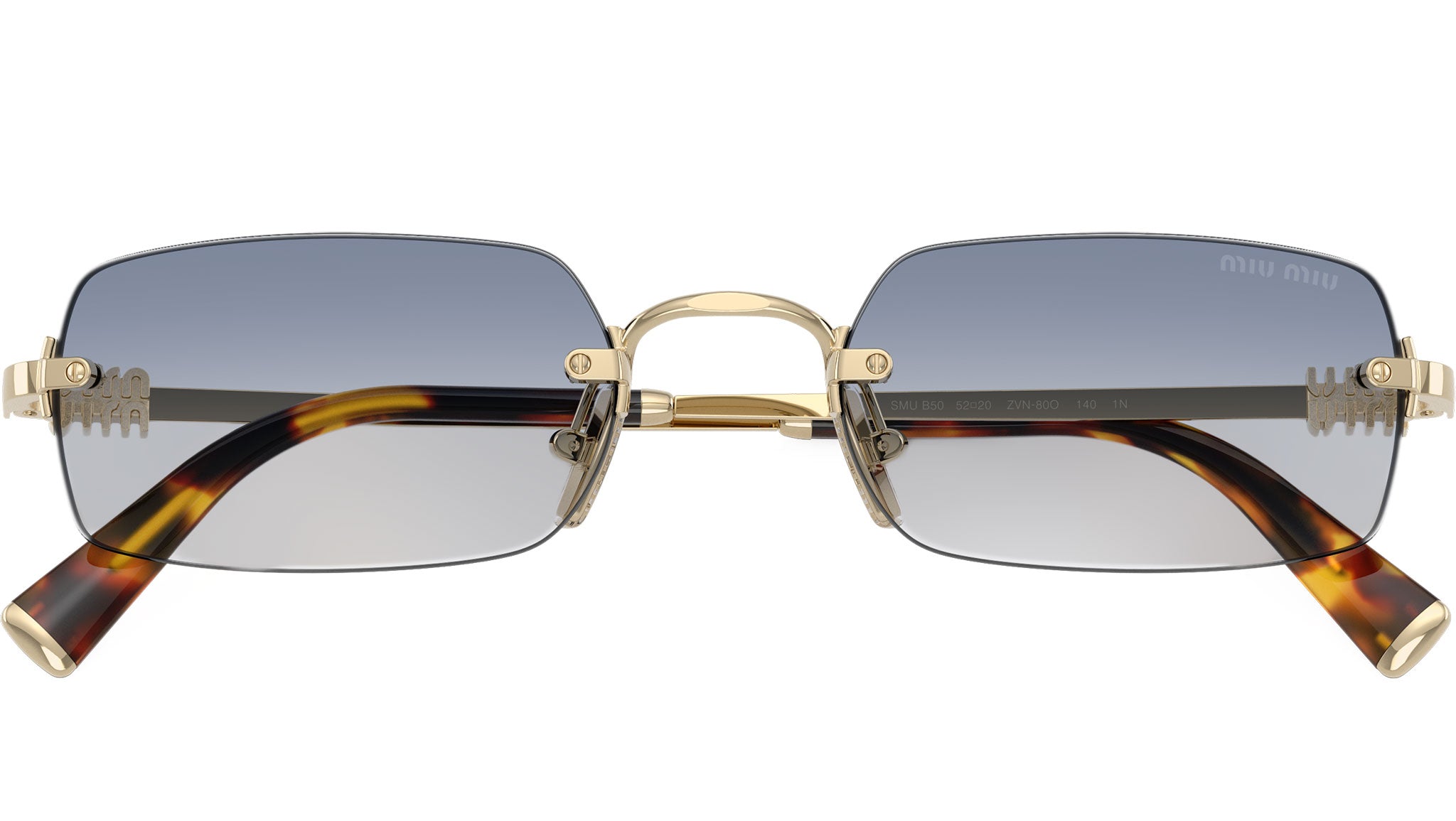 Новая прямоугольная форма безободковой модели Miu Miu с голубой градиентной линзой с золотистыми дужками, украшенными фирменным логотипом бренда. Легкие, комфортные, с расслабленным стилем – их хочется носить каждый день и можно сочетать со всем: от голубых джинсов до легких платьев.