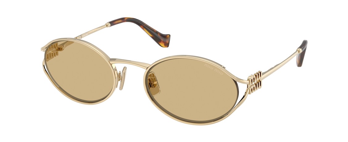 Хит от MIU MIU – очки овальный формы с тонкими дужками, украшенными фактурным логотипом бренда. Модель со светло-коричневыми линзами в оправе из золотистого металла.